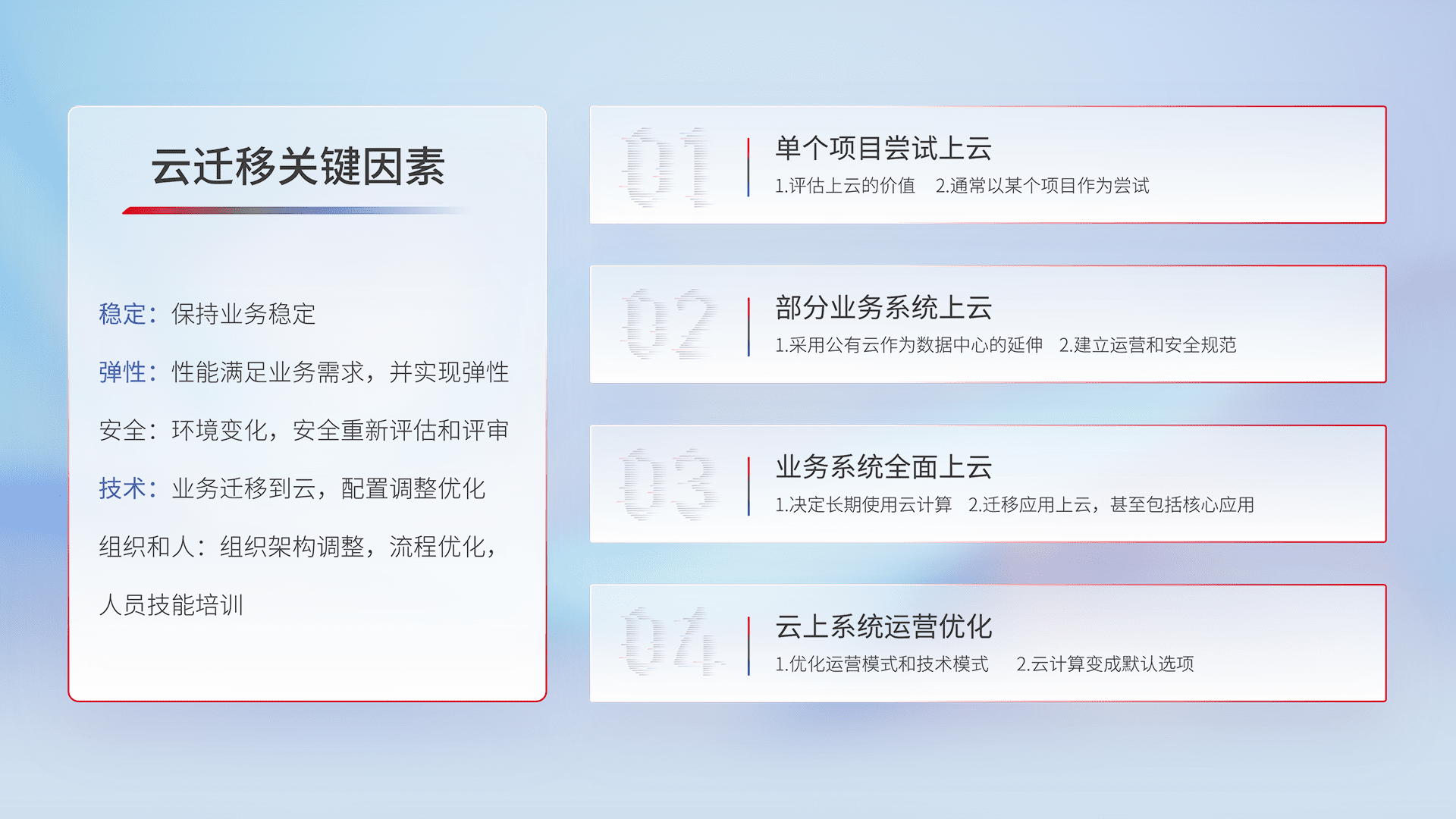 结合实际业务,,,从规划设计、、、云平台选型、、、云原生改造、、数据迁移、、、集成交付,,,,迁移全过程为客户识别最佳上云路径,,,做好风险识别管理,,,,设计网络架构、、身份权限、、、、安全审计合规、、、操作审计、、、日志审计、、监控告警策略、、多站点容灾设计等,,,,对云上基础设施进行整体规划,,提升IT治理水平,,,以满足弹性、、、、高可用、、高性能的需求。。