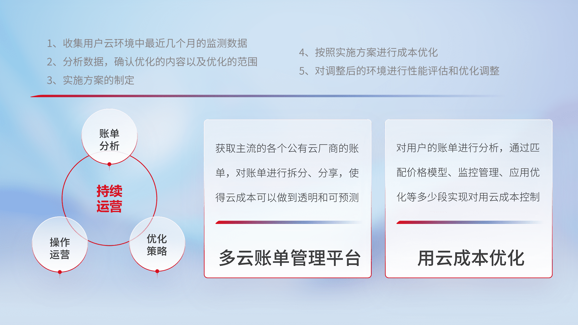 通过多云纳管,,以统一的资源数据模型把客户的云资源进行抽象和封装,,,,进而实现对多云资源的统一操作,,,,保障云资源管理的可靠性、、、稳定性与可用性。。量身定制化运维内容,,,配置、、、、开发运维、、、补丁管理、、、、备份、、、监控、、认证和访问管理、、、、审计和日常巡检等,,,保障在用云过程中的可靠度,,,,稳定度以及高可用率。。